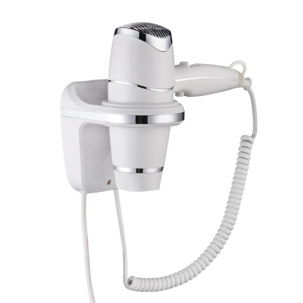 Phon a pistola per hotel, B&B, residence e tutti i contesti dedicati all’ospitalità. Estetica di fascia premium grazie ai particolari cromati sul phon e sulla base murale. Rappresenta il top di gamma per gli asciugacapelli da albergo.