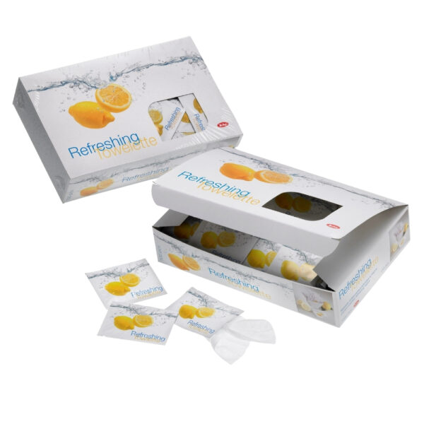 Confezione da 100 salviettine rinfrescanti in 100% cellulosa 12,5 x 19 cm, materiale compostabile. Incarto esterno in carta. Imbustate singolarmente. Aroma al limone. Monodose. Prodotto cosmetico. Uso esterno.