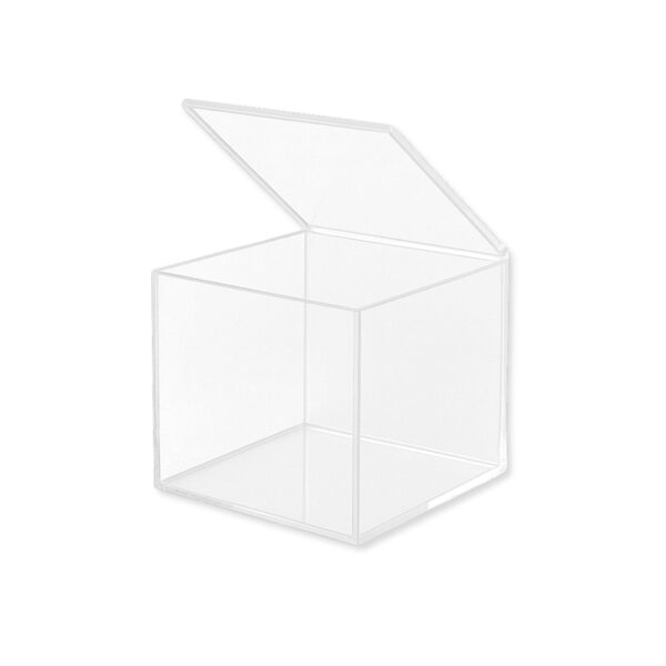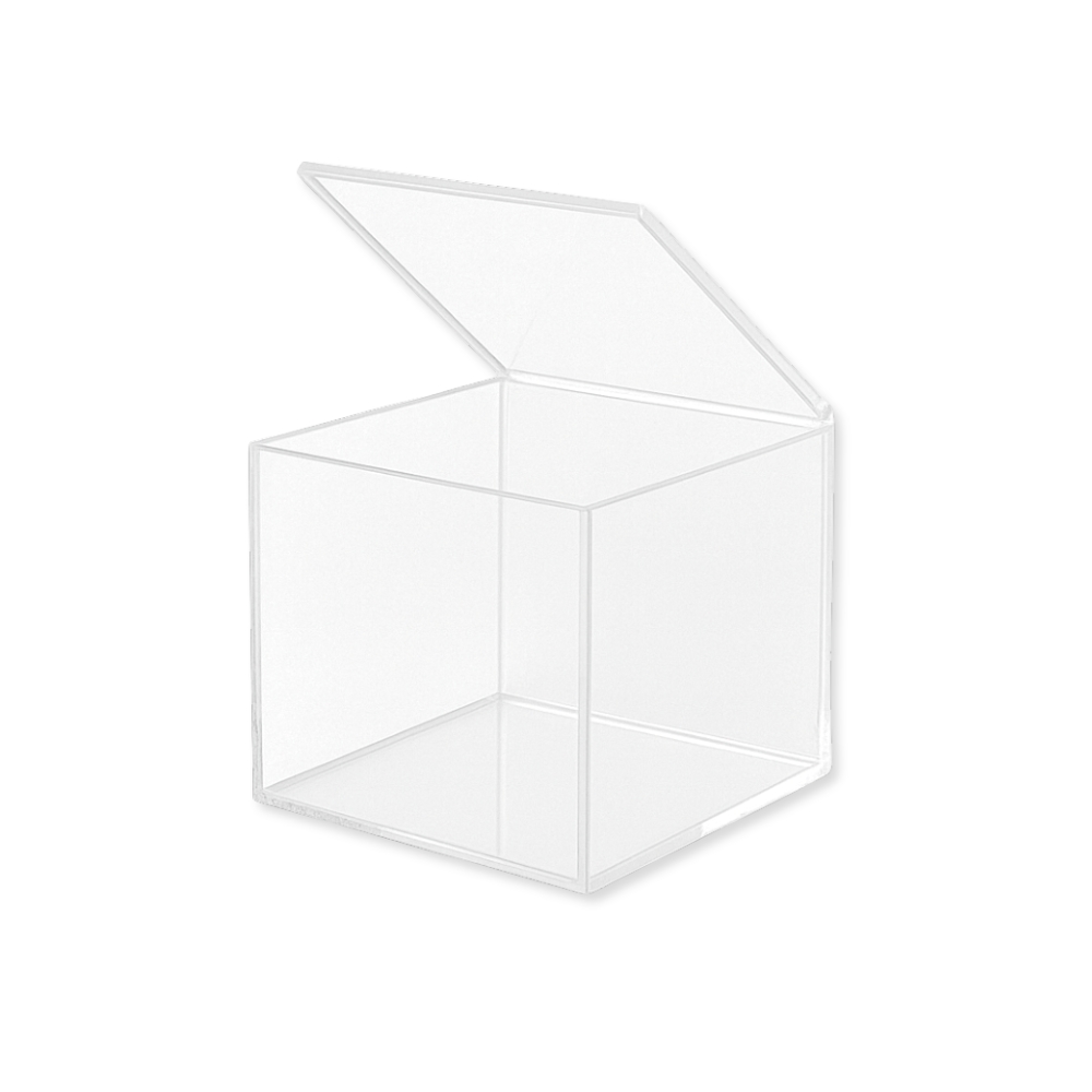 Box in acrilico/plexiglass trasparente con coperchio unito sollevabile, ideale per il confezionamento di prodotti con incarto o accessori vari. Non adatta al contatto diretto con alimenti. Dimensioni: 10 x 10 x H 10 cm.
