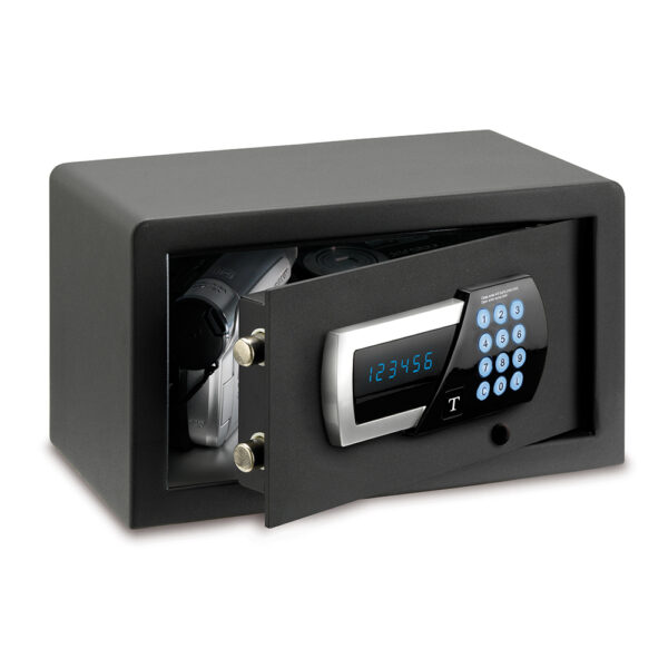 Spessore porta: 5 mm. Spessore corpo: 1,5 mm. Serratura motorizzata controllata da un congegno elettronico ad alta affidabilità. Illuminazione della tastiera a LED blu alla digitazione di un qualsiasi tasto. Codice Cliente programmabile da 4 a 6 cifre. Segnalazione di tutte le funzioni mediante display a LED colore blu a 6 posizioni con alto contrasto cromatico. Possibilità di programmare il codice Master ad uso esclusivo dell’Albergatore. Serratura a chiave per apertura di emergenza (identica per tutte le casseforti dello stesso hotel). Visualizzazione a display degli ultimi 100 eventi (apertura, chiusura). Funzionamento con 4 batterie alcaline da 1,5 V. Tappetino sulla base. Fori di ancoraggio sullo schienale e sulla base (2+2). Viti per fissaggio in dotazione. Verniciatura a polvere termoindurente colore nero. Numero catenacci: 2. peso: 6 kg. Volume: 7 lt.