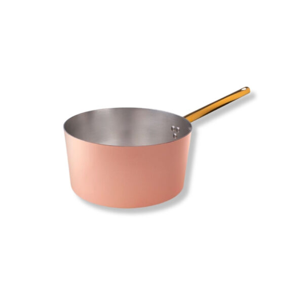 Gli strumenti di cottura in rame sono apprezzati per la loro eccellente conducibilità termica, che permette una distribuzione uniforme del calore e un controllo preciso della temperatura. Questo li rende ideali per preparazioni che richiedono una cottura delicata e costante, come salse e caramelli. Il rame, spesso rivestito internamente con uno strato di stagno per evitare reazioni chimiche con gli alimenti, è anche noto per la sua durata e resistenza. Capacità di condurre il calore: 396 W/K°.