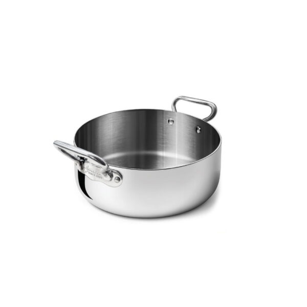 Casseruola bassa in aluinox 3ply lucido. Composizione 3 strati: alluminio interno e acciaio esterno. Finitura a specchio. Spessore di 2,5 mm. 2 manici in acciaio inox. Adatta per i piani cottura a induzione, gas, elettrici e radianti.