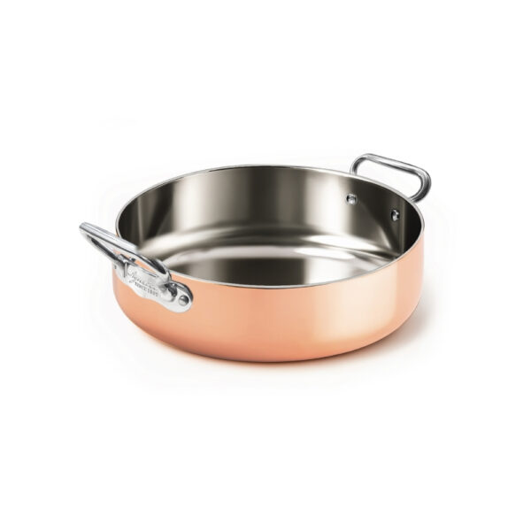Rondeau dallo spessore di 2,5 mm. 2 manici in acciaio inox. Adatta per i piani cottura a induzione, gas, elettrici e radianti. Materiale: Copper 4 – Composizione 4 strati: acciaio inox, alluminio, acciaio ferritico e rame (Copper 4).