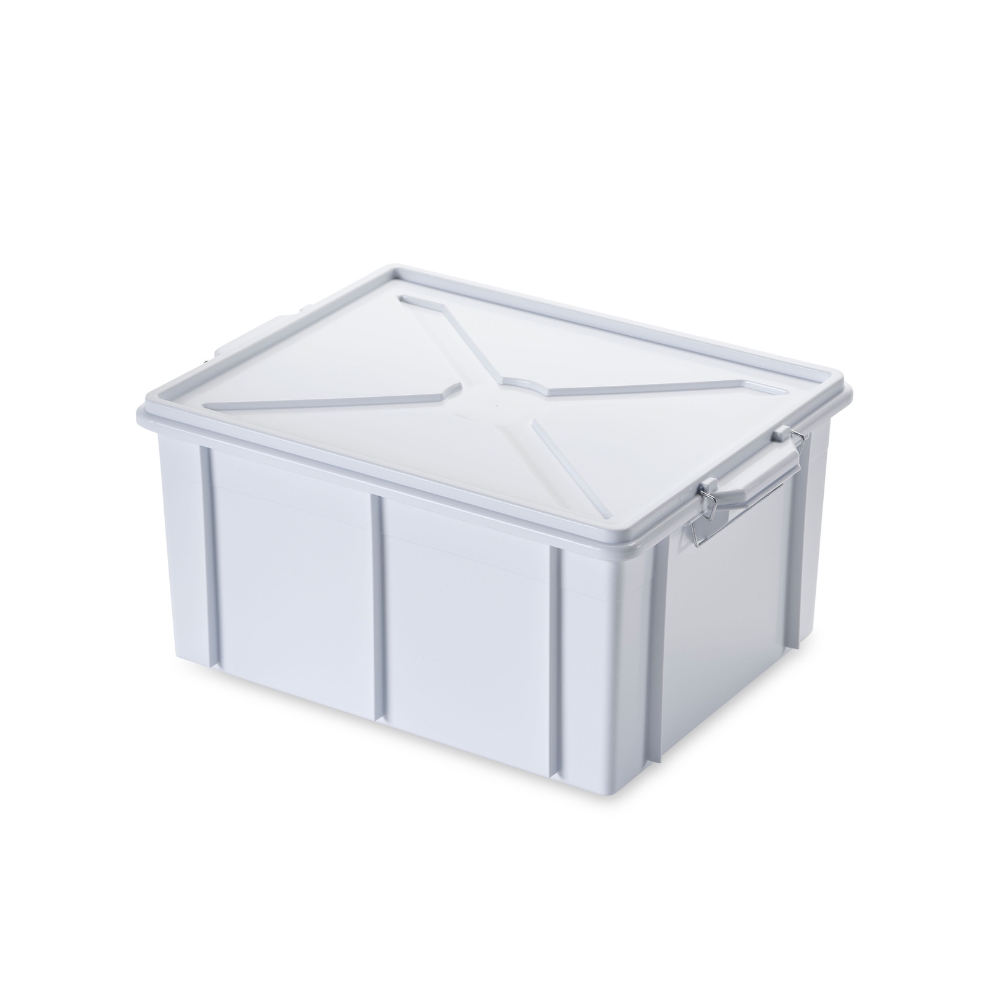 Cassetta box con coperchio. Colore: Bianco. Chiusura con ganci laterali in ferro zincato. Materiale: Polipropilene. Adatto per alimenti. Adatto per congelatore. Idoneo per forno microonde. Lavabile in lavastoviglie. Sovrapponibile. Made in Italy.