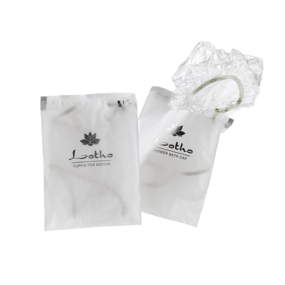 Confezione da 100 cuffiette per doccia, imbustate singolarmente. Cuffia in PE (Polietilene) trasparente. Busta esterna bianca e argento. Prodotto monouso. Ideale per i set cortesia.