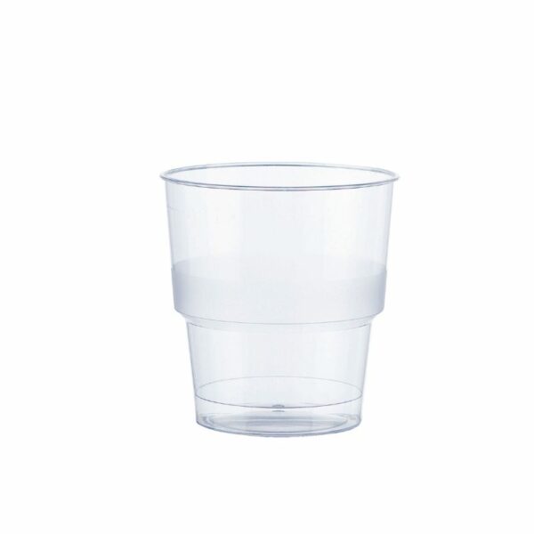 Confezione: 50 pz. Bicchieri in plastica (PS – polistirene o polistirolo) trasparente e fascia satinata. Capacità: 250 ml. Tacca a 200 ml.