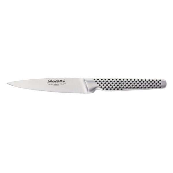 Coltello con lama forgiata in acciaio speciale Cromova 18 al molibdeno-vanadio, con grado di durezza 56-58 HRC (Scala Rockwell). Il manico è in acciaio inox pieno. La lama è affilata a mano per un’ottima tenuta del filo. La Serie GSF è composta di spelucchini con lame di varie forme per sbucciare e mondare frutta e verdura e, in generale, per effettuare tutti quei piccoli lavoretti quotidiani indispensabili nelle preparazioni dei cibi. È importante dire che nessun coltello in acciaio inossidabile può essere totalmente resistente alla ruggine. Pertanto è opportuno che, una volta terminato l’utilizzo del coltello, i residui di cibo, specialmente se contenenti sostanze acide (come succhi di frutti o verdure, senape, ketchup) vengano rapidamente sciacquati dalla lama. Come per tutti i coltelli, anche le lame di qualità come Global nn devono essere lavate in lavastoviglie, poichè non le alte temperature ma i sali ossidanti contenuti nei detergenti, sono estremamente dannosi per la lama e la tenuta del filo. Consigli per una corretta manutenzione del coltello: lavare i coltelli a mano evitando spugne abrasive (che possono creare micro-abrasioni nelle lame) in acqua calda, utilizzando saponi o detergenti neutri, risciacquare con cura e asciugare immediatamente con un panno morbido.