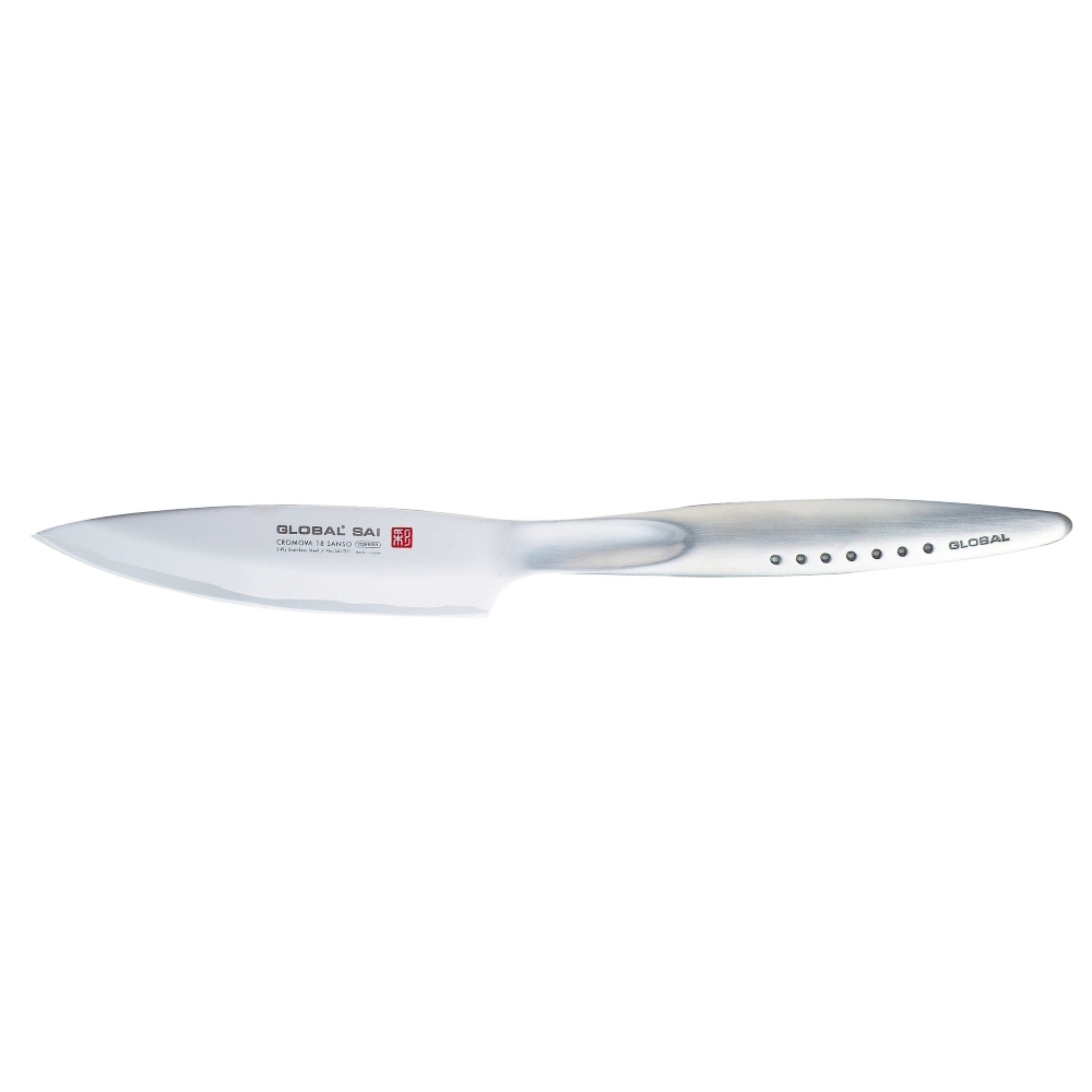 I coltelli Global della Serie SAI sono stati progettati da Komin Yamada, creatore del primo coltello Global. È una Serie per professionisti e appassionati. Possiedono le seguenti caratteristiche: – design del manico ergonomico, con un incavo per il pollice per facilitare il taglio. I 7 punti rappresentano il bushido del guerriero e ogni punto simboleggia le virtù di un samurai; – le lame sono realizzate nello speciale acciaio CROMOVA 18 Sanso composto da tre strati sovrapposti in acciaio inossidabile. La parte centrale è composta da CROMOVA 18 acciaio inossidabile, temperato Rockwell 58-59 gradi e levigato sul bordo così da garantire eccezionali prestazioni di taglio. I due strati più esterni sono invece in acciaio inossidabile SUS410 (più “morbido”) che protegge la lama da scheggiature, ruggine e macchie; – finitura “martellata” su entrambi i lati della lama: non è soltanto un decoro, ma una lavorazione che evita che durante le operazioni di taglio restitino appiccicati residui di cibo sulla lama.