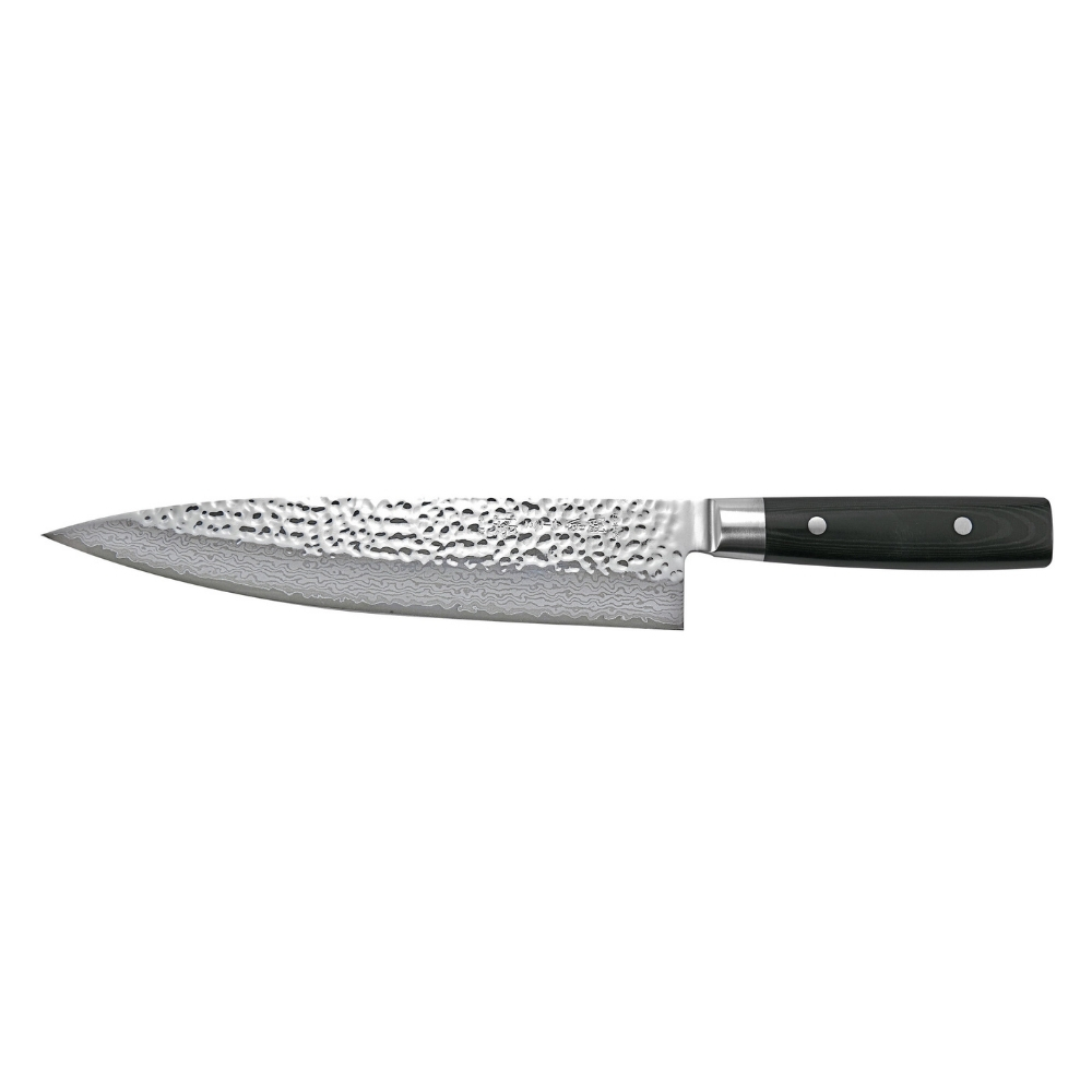 Coltello cuoco con lama in acciaio inossidabile giapponese VG10 ricoperto da 18 strati di acciaio inossidabile morbido e duro ad alto tenore di carbonio, creando un effetto damascato. Manico resisitente in Canvas-Micarta (resina e fibra di lino). Dimensioni lama: 24 cm. Dimensioni totali: 37,5 cm.