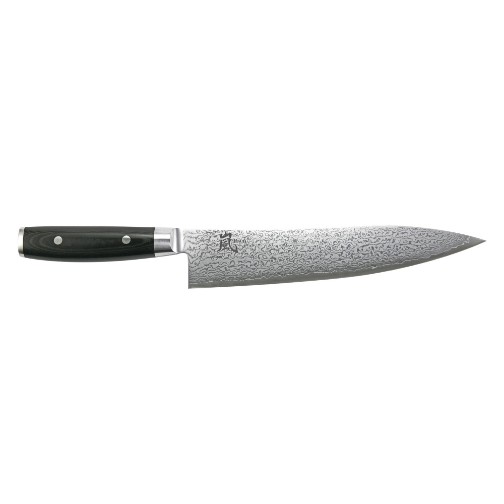 I coltelli professionali in acciaio damascato della Serie RAN sono in Serie con i tempi. La lama è provvista di un’affilatura a rasoio estremamente efficace. Il nucleo centrale è realizzato in acciaio giapponese VG10 al cobalto molibdeno con una durezza Rockwell di 61HRC, ricoperto da 34 strati d’acciaio inox a rgidità variabile su ogni lato, per un totale di 69 strati. La superficie è arricchita da una cesellatura damascata. Il coltello viene affilato a mano e lavorato in cinque cicli di lavorazione. Ogni coltello è un esemplare unico. Il manico del coltello è realizzato in materiale Canvas-Micarta, approvato dalle norme FDA. Si tratta di materiale estremamente durevole e resistente, costituito da resine e fibra di lino di colore nero. Esso presenta un’accurata finitura ed è destinato a durare per decenni. Il manico è rifinito con un pomolo in acciaio inox che conferisce al coltello eccezionali doti di stabilità, bilanciatura e funzionalità. Due rivetti in acciaio inossidabile fissano saldamente l’impugnatura.