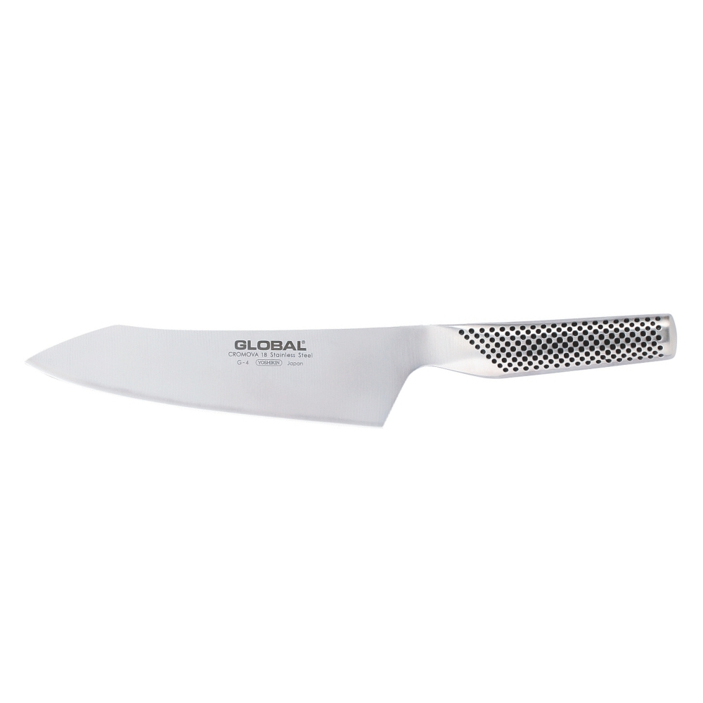 I coltelli Global della Serie G sono caratterizzati da una lama tranciata in acciaio speciale Cromova 18, al molibdeno-vanadio, con grado di durezza 56-58 HRC (Scala Rockewell). Il manico in acciaio inox è cavo e riempito con sabbia per un perfetto bilanciamento del coltello. La lama è affilata a mano per un’ottima tenuta del filo. La forma anatomica del manico e la leggerezza del coltello (circa il 30% in meno rispetto ai coltelli con manico tradizionale) riducono l’affaticamento dell’utilizzatore, anche in caso di utilizzo prolungato. È importante dire che nessun coltello in acciaio inossidabile può essere totalmente resistente alla ruggine. Pertanto è opportuno che, una volta terminato l’utilizzo del coltello, i residui di cibo, specialmente se contenenti sostanze acide (come succhi di frutti o verdure, senape, ketchup) vengano rapidamente sciacquati dalla lama. Come per tutti i coltelli, anche le lame di qualità come Global nn devono essere lavate in lavastoviglie, poichè non le alte temperature ma i sali ossidanti contenuti nei detergenti, sono estremamente dannosi per la lama e la tenuta del filo. Consigli per una corretta manutenzione del coltello: lavare i coltelli a mano evitando spugne abrasive (che possono creare micro-abrasioni nelle lame) in acqua calda, utilizzando saponi o detergenti neutri, risciacquare con cura e asciugare immediatamente con un panno morbido.