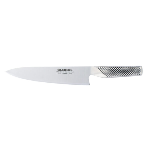 I coltelli Global della Serie G sono caratterizzati da una lama tranciata in acciaio speciale Cromova 18, al molibdeno-vanadio, con grado di durezza 56-58 HRC (Scala Rockewell). Il manico in acciaio inox è cavo e riempito con sabbia per un perfetto bilanciamento del coltello. La lama è affilata a mano per un’ottima tenuta del filo. La forma anatomica del manico e la leggerezza del coltello (circa il 30% in meno rispetto ai coltelli con manico tradizionale) riducono l’affaticamento dell’utilizzatore, anche in caso di utilizzo prolungato. È importante dire che nessun coltello in acciaio inossidabile può essere totalmente resistente alla ruggine. Pertanto è opportuno che, una volta terminato l’utilizzo del coltello, i residui di cibo, specialmente se contenenti sostanze acide (come succhi di frutti o verdure, senape, ketchup) vengano rapidamente sciacquati dalla lama. Come per tutti i coltelli, anche le lame di qualità come Global nn devono essere lavate in lavastoviglie, poichè non le alte temperature ma i sali ossidanti contenuti nei detergenti, sono estremamente dannosi per la lama e la tenuta del filo. Consigli per una corretta manutenzione del coltello: lavare i coltelli a mano evitando spugne abrasive (che possono creare micro-abrasioni nelle lame) in acqua calda, utilizzando saponi o detergenti neutri, risciacquare con cura e asciugare immediatamente con un panno morbido.