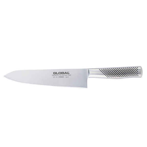 I coltelli Global della Serie GF sono caratterizzati da una lama forgiata in acciaio speciale Cromova 18, al molibdeno-vanadio, con grado di durezza 56-58 HRC (Scala Rockewell), manico più grande e costa della lama più spessa. Il manico in acciaio inox è cavo e riempito con sabbia per un perfetto bilanciamento del coltello. La lama è affilata a mano per un’ottima tenuta del filo. In generale si tratta di un coltello più pesante rispetto alla Serie G, preferito dai professionisti, “costretti” a utilizzare il coltello per molte ore al giorno, in quanto è il peso del coltello a “fare il taglio”.