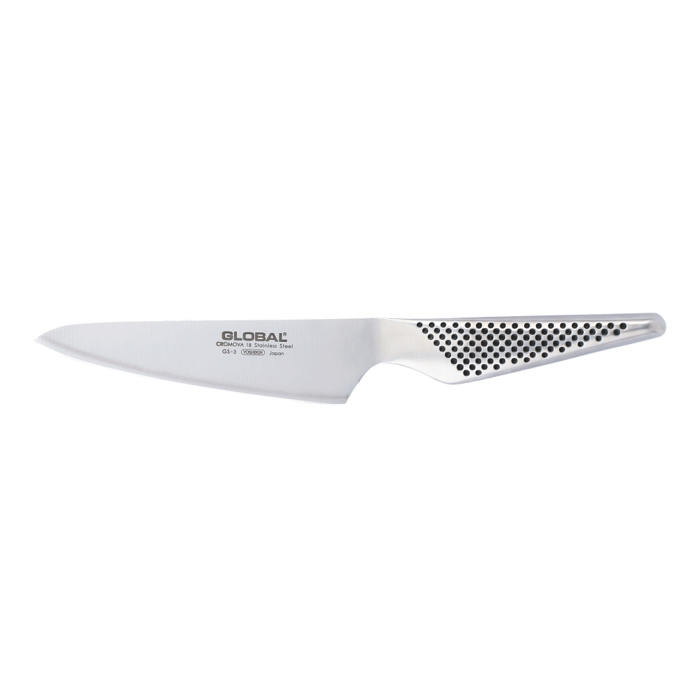 Coltello con lama tranciata in acciaio speciale Cromova 18 al molibdeno-vanadio, con grado di durezza 56-58 HRC (Scala Rockwell). Il manico in acciaio inox è cavo e riempito con sabbia per un perfetto bilanciamento del coltello. La lama è affilata a mano per un’ottima tenuta del filo. La Serie GS si caratterizza per ina manicatura a forma “triangolare” che meglio si adatta ad un utilizzatore con mani piccole – come le donne – e lame più corte rispetto alla Serie G. I coltelli Global GS sono ottimi per mondare e tagliare ortaggi e frutta, lavorare pesce e crostacei. È importante dire che nessun coltello in acciaio inossidabile può essere totalmente resistente alla ruggine. Pertanto è opportuno che, una volta terminato l’utilizzo del coltello, i residui di cibo, specialmente se contenenti sostanze acide (come succhi di frutti o verdure, senape, ketchup) vengano rapidamente sciacquati dalla lama. Come per tutti i coltelli, anche le lame di qualità come Global nn devono essere lavate in lavastoviglie, poichè non le alte temperature ma i sali ossidanti contenuti nei detergenti, sono estremamente dannosi per la lama e la tenuta del filo. Consigli per una corretta manutenzione del coltello: lavare i coltelli a mano evitando spugne abrasive (che possono creare micro-abrasioni nelle lame) in acqua calda, utilizzando saponi o detergenti neutri, risciacquare con cura e asciugare immediatamente con un panno morbido.