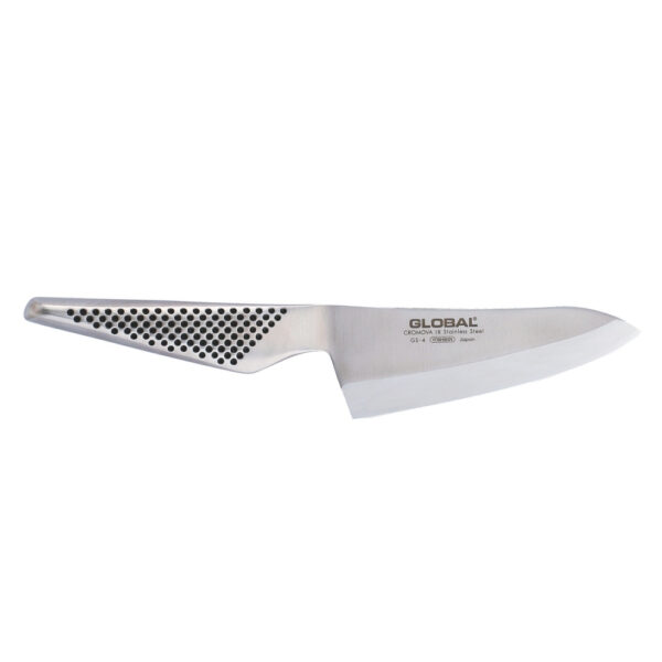 Coltello con lama tranciata in acciaio speciale Cromova 18 al molibdeno-vanadio, con grado di durezza 56-58 HRC (Scala Rockwell). Il manico in acciaio inox è cavo e riempito con sabbia per un perfetto bilanciamento del coltello. La lama è affilata a mano per un’ottima tenuta del filo. La Serie GS si caratterizza per ina manicatura a forma “triangolare” che meglio si adatta ad un utilizzatore con mani piccole – come le donne – e lame più corte rispetto alla Serie G. I coltelli Global GS sono ottimi per mondare e tagliare ortaggi e frutta, lavorare pesce e crostacei. È importante dire che nessun coltello in acciaio inossidabile può essere totalmente resistente alla ruggine. Pertanto è opportuno che, una volta terminato l’utilizzo del coltello, i residui di cibo, specialmente se contenenti sostanze acide (come succhi di frutti o verdure, senape, ketchup) vengano rapidamente sciacquati dalla lama. Come per tutti i coltelli, anche le lame di qualità come Global nn devono essere lavate in lavastoviglie, poichè non le alte temperature ma i sali ossidanti contenuti nei detergenti, sono estremamente dannosi per la lama e la tenuta del filo. Consigli per una corretta manutenzione del coltello: lavare i coltelli a mano evitando spugne abrasive (che possono creare micro-abrasioni nelle lame) in acqua calda, utilizzando saponi o detergenti neutri, risciacquare con cura e asciugare immediatamente con un panno morbido.