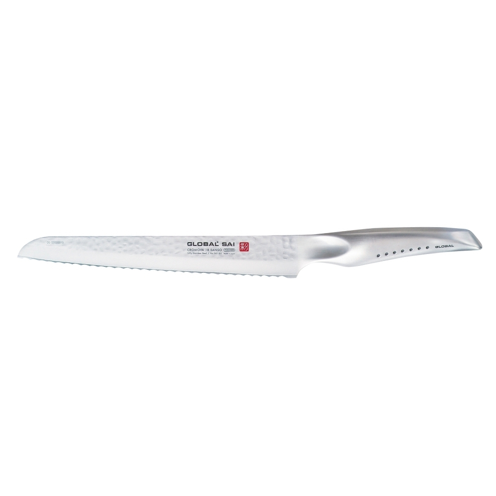 I coltelli Global della Serie SAI sono stati progettati da Komin Yamada, creatore del primo coltello Global. È una Serie per professionisti e appassionati. Possiedono le seguenti caratteristiche: – design del manico ergonomico, con un incavo per il pollice per facilitare il taglio. I 7 punti rappresentano il bushido del guerriero e ogni punto simboleggia le virtù di un samurai; – le lame sono realizzate nello speciale acciaio CROMOVA 18 Sanso composto da tre strati sovrapposti in acciaio inossidabile. La parte centrale è composta da CROMOVA 18 acciaio inossidabile, temperato Rockwell 58-59 gradi e levigato sul bordo così da garantire eccezionali prestazioni di taglio. I due strati più esterni sono invece in acciaio inossidabile SUS410 (più “morbido”) che protegge la lama da scheggiature, ruggine e macchie; – finitura “martellata” su entrambi i lati della lama: non è soltanto un decoro, ma una lavorazione che evita che durante le operazioni di taglio restitino appiccicati residui di cibo sulla lama.