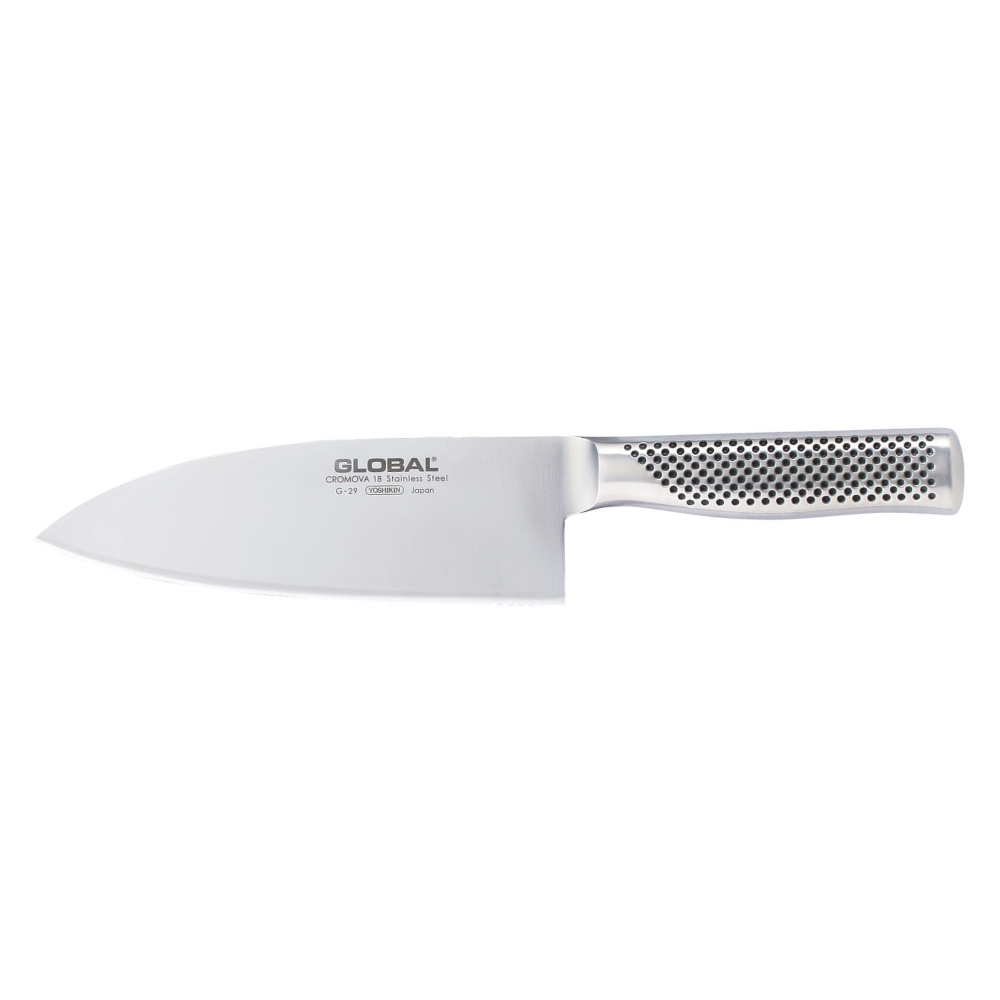 I coltelli Global della Serie G sono caratterizzati da una lama tranciata in acciaio speciale Cromova 18, al molibdeno-vanadio, con grado di durezza 56-58 HRC (Scala Rockewell). Il manico in acciaio inox è cavo e riempito con sabbia per un perfetto bilanciamento del coltello. La lama è affilata a mano per un’ottima tenuta del filo. La forma anatomica del manico e la leggerezza del coltello (circa il 30% in meno rispetto ai coltelli con manico tradizionale) riducono l’affaticamento dell’utilizzatore, anche in caso di utilizzo prolungato. È importante dire che nessun coltello in acciaio inossidabile può essere totalmente resistente alla ruggine. Pertanto è opportuno che, una volta terminato l’utilizzo del coltello, i residui di cibo, specialmente se contenenti sostanze acide (come succhi di frutti o verdure, senape, ketchup) vengano rapidamente sciacquati dalla lama. Come per tutti i coltelli, anche le lame di qualità come Global nn devono essere lavate in lavastoviglie, poichè non le alte temperature ma i sali ossidanti contenuti nei detergenti, sono estremamente dannosi per la lama e la tenuta del filo. Consigli per una corretta manutenzione del coltello: lavare i coltelli a mano evitando spugne abrasive (che possono creare micro-abrasioni nelle lame) in acqua calda, utilizzando saponi o detergenti neutri, risciacquare con cura e asciugare immediatamente con un panno morbido.