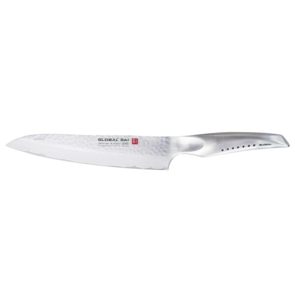 I coltelli Global della Serie SAI sono stati progettati da Komin Yamada, creatore del primo coltello Global. È una Serie per professionisti e appassionati. Possiedono le seguenti caratteristiche: – design del manico ergonomico, con un incavo per il pollice per facilitare il taglio. I 7 punti rappresentano il bushido del guerriero e ogni punto simboleggia le virtù di un samurai; – le lame sono realizzate nello speciale acciaio CROMOVA 18 Sanso composto da tre strati sovrapposti in acciaio inossidabile. La parte centrale è composta da CROMOVA 18 acciaio inossidabile, temperato Rockwell 58-59 gradi e levigato sul bordo così da garantire eccezionali prestazioni di taglio. I due strati più esterni sono invece in acciaio inossidabile SUS410 (più “morbido”) che protegge la lama da scheggiature, ruggine e macchie; – finitura “martellata” su entrambi i lati della lama: non è soltanto un decoro, ma una lavorazione che evita che durante le operazioni di taglio restitino appiccicati residui di cibo sulla lama.