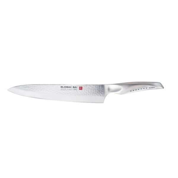 I coltelli Global della Serie SAI sono stati progettati da Komin Yamada, creatore del primo coltello Global. È una Serie per professionisti e appassionati. Possiedono le seguenti caratteristiche: – design del manico ergonomico, con un incavo per il pollice per facilitare il taglio. I 7 punti rappresentano il bushido del guerriero e ogni punto simboleggia le virtù di un samurai; – le lame sono realizzate nello speciale acciaio CROMOVA 18 Sanso composto da tre strati sovrapposti in acciaio inossidabile. La parte centrale è composta da CROMOVA 18 acciaio inossidabile, temperato Rockwell 58-59 gradi e levigato sul bordo così da garantire eccezionali prestazioni di taglio. I due strati più esterni sono invece in acciaio inossidabile SUS410 (più “morbido”) che protegge la lama da scheggiature, ruggine e macchie; – finitura “martellata” su entrambi i lati della lama: non è soltanto un decoro, ma una lavorazione che evita che durante le operazioni di taglio restitino appiccicati residui di cibo sulla lama.
