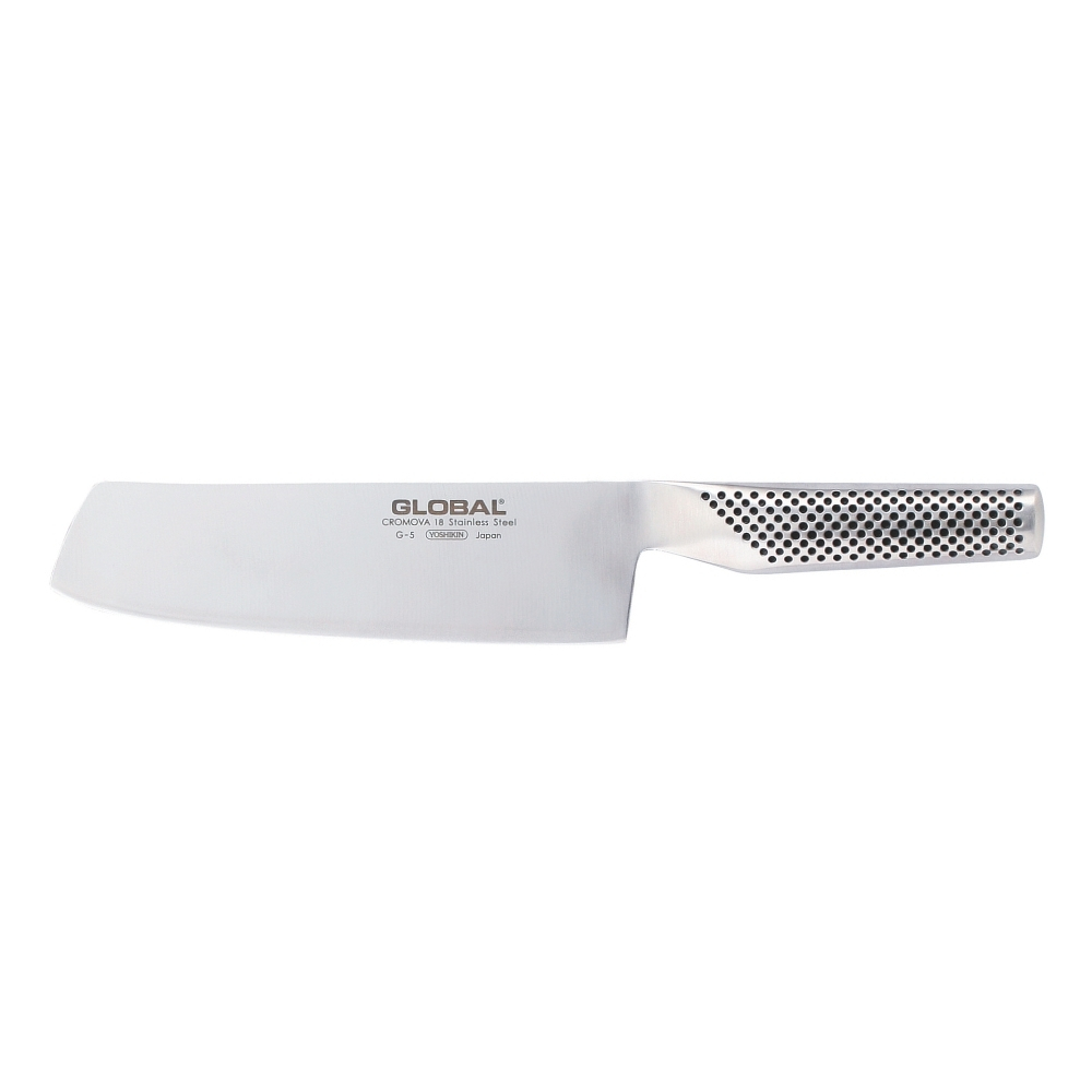 I coltelli Global della Serie G sono caratterizzati da una lama tranciata in acciaio speciale Cromova 18, al molibdeno-vanadio, con grado di durezza 56-58 HRC (Scala Rockewell). Il manico in acciaio inox è cavo e riempito con sabbia per un perfetto bilanciamento del coltello. La lama è affilata a mano per un’ottima tenuta del filo. La forma anatomica del manico e la leggerezza del coltello (circa il 30% in meno rispetto ai coltelli con manico tradizionale) riducono l’affaticamento dell’utilizzatore, anche in caso di utilizzo prolungato. È importante dire che nessun coltello in acciaio inossidabile può essere totalmente resistente alla ruggine. Pertanto è opportuno che, una volta terminato l’utilizzo del coltello, i residui di cibo, specialmente se contenenti sostanze acide (come succhi di frutti o verdure, senape, ketchup) vengano rapidamente sciacquati dalla lama. Come per tutti i coltelli, anche le lame di qualità come Global nn devono essere lavate in lavastoviglie, poichè non le alte temperature ma i sali ossidanti contenuti nei detergenti, sono estremamente dannosi per la lama e la tenuta del filo. Consigli per una corretta manutenzione del coltello: lavare i coltelli a mano evitando spugne abrasive (che possono creare micro-abrasioni nelle lame) in acqua calda, utilizzando saponi o detergenti neutri, risciacquare con cura e asciugare immediatamente con un panno morbido.