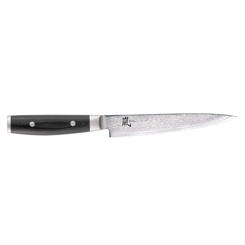 I coltelli professionali in acciaio damascato della Serie RAN sono in Serie con i tempi. La lama è provvista di un’affilatura a rasoio estremamente efficace. Il nucleo centrale è realizzato in acciaio giapponese VG10 al cobalto molibdeno con una durezza Rockwell di 61HRC, ricoperto da 34 strati d’acciaio inox a rgidità variabile su ogni lato, per un totale di 69 strati. La superficie è arricchita da una cesellatura damascata. Il coltello viene affilato a mano e lavorato in cinque cicli di lavorazione. Ogni coltello è un esemplare unico. Il manico del coltello è realizzato in materiale Canvas-Micarta, approvato dalle norme FDA. Si tratta di materiale estremamente durevole e resistente, costituito da resine e fibra di lino di colore nero. Esso presenta un’accurata finitura ed è destinato a durare per decenni. Il manico è rifinito con un pomolo in acciaio inox che conferisce al coltello eccezionali doti di stabilità, bilanciatura e funzionalità. Due rivetti in acciaio inossidabile fissano saldamente l’impugnatura.