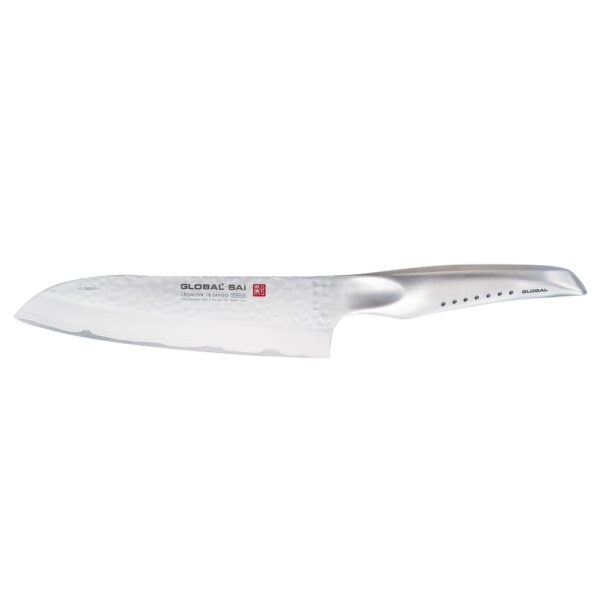 I coltelli Global della Serie SAI sono stati progettati da Komin Yamada, creatore del primo coltello Global. Ă una Serie per professionisti e appassionati. Possiedono le seguenti caratteristiche: – design del manico ergonomico, con un incavo per il pollice per facilitare il taglio. I 7 punti rappresentano il bushido del guerriero e ogni punto simboleggia le virtĂč di un samurai; – le lame sono realizzate nello speciale acciaio CROMOVA 18 Sanso composto da tre strati sovrapposti in acciaio inossidabile. La parte centrale Ăš composta da CROMOVA 18 acciaio inossidabile, temperato Rockwell 58-59 gradi e levigato sul bordo cosĂŹ da garantire eccezionali prestazioni di taglio. I due strati piĂč esterni sono invece in acciaio inossidabile SUS410 (piĂč “morbido”) che protegge la lama da scheggiature, ruggine e macchie; – finitura “martellata” su entrambi i lati della lama: non Ăš soltanto un decoro, ma una lavorazione che evita che durante le operazioni di taglio restitino appiccicati residui di cibo sulla lama.
