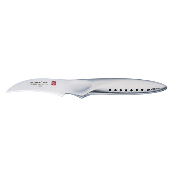 I coltelli Global della Serie SAI sono stati progettati da Komin Yamada, creatore del primo coltello Global. È una Serie per professionisti e appassionati. Possiedono le seguenti caratteristiche: – design del manico ergonomico, con un incavo per il pollice per facilitare il taglio. I 7 punti rappresentano il bushido del guerriero e ogni punto simboleggia le virtù di un samurai; – le lame sono realizzate nello speciale acciaio CROMOVA 18 Sanso composto da tre strati sovrapposti in acciaio inossidabile. La parte centrale è composta da CROMOVA 18 acciaio inossidabile, temperato Rockwell 58-59 gradi e levigato sul bordo così da garantire eccezionali prestazioni di taglio. I due strati più esterni sono invece in acciaio inossidabile SUS410 (più “morbido”) che protegge la lama da scheggiature, ruggine e macchie; – finitura “martellata” su entrambi i lati della lama: non è soltanto un decoro, ma una lavorazione che evita che durante le operazioni di taglio restitino appiccicati residui di cibo sulla lama.