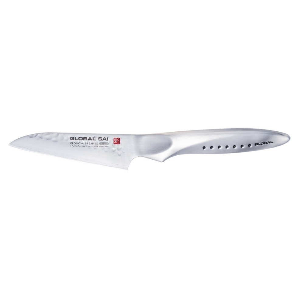 I coltelli Global della Serie SAI sono stati progettati da Komin Yamada, creatore del primo coltello Global. È una Serie per professionisti e appassionati. Possiedono le seguenti caratteristiche: – design del manico ergonomico, con un incavo per il pollice per facilitare il taglio. I 7 punti rappresentano il bushido del guerriero e ogni punto simboleggia le virtù di un samurai; – le lame sono realizzate nello speciale acciaio CROMOVA 18 Sanso composto da tre strati sovrapposti in acciaio inossidabile. La parte centrale è composta da CROMOVA 18 acciaio inossidabile, temperato Rockwell 58-59 gradi e levigato sul bordo così da garantire eccezionali prestazioni di taglio. I due strati più esterni sono invece in acciaio inossidabile SUS410 (più “morbido”) che protegge la lama da scheggiature, ruggine e macchie; – finitura “martellata” su entrambi i lati della lama: non è soltanto un decoro, ma una lavorazione che evita che durante le operazioni di taglio restitino appiccicati residui di cibo sulla lama.