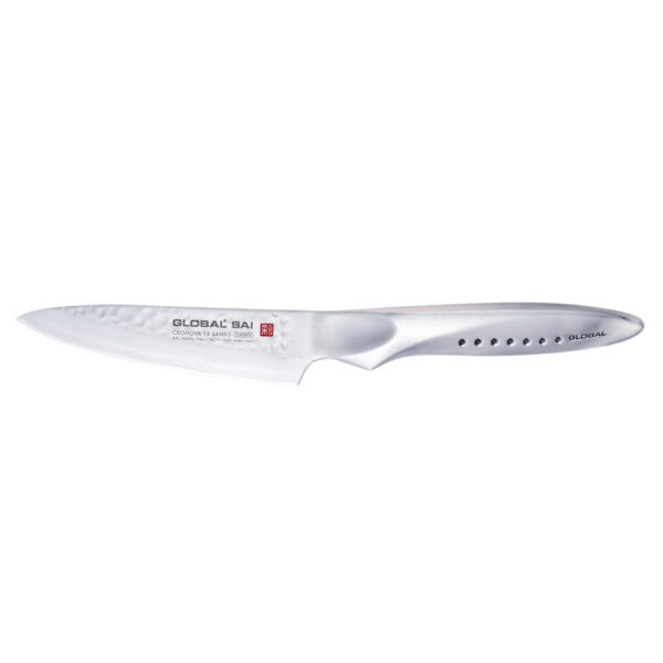 I coltelli Global della Serie SAI sono stati progettati da Komin Yamada, creatore del primo coltello Global. È una Serie per professionisti e appassionati. Possiedono le seguenti caratteristiche: – design del manico ergonomico, con un incavo per il pollice per facilitare il taglio. I 7 punti rappresentano il bushido del guerriero e ogni punto simboleggia le virtù di un samurai; – le lame sono realizzate nello speciale acciaio CROMOVA 18 Sanso composto da tre strati sovrapposti in acciaio inossidabile. La parte centrale è composta da CROMOVA 18 acciaio inossidabile, temperato Rockwell 58-59 gradi e levigato sul bordo così da garantire eccezionali prestazioni di taglio. I due strati più esterni sono invece in acciaio inossidabile SUS410 (più “morbido”) che protegge la lama da scheggiature, ruggine e macchie; – finitura “martellata” su entrambi i lati della lama: non è soltanto un decoro, ma una lavorazione che evita che durante le operazioni di taglio restitino appiccicati residui di cibo sulla lama.