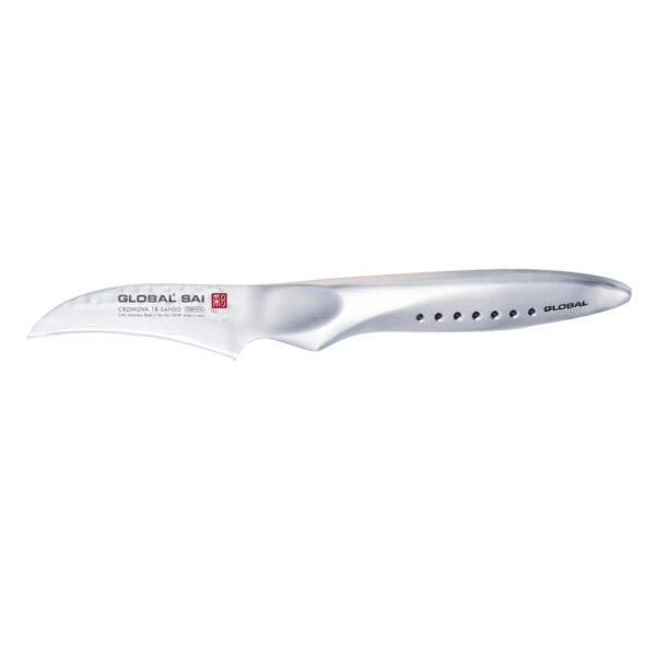 I coltelli Global della Serie SAI sono stati progettati da Komin Yamada, creatore del primo coltello Global. È una Serie per professionisti e appassionati. Possiedono le seguenti caratteristiche: – design del manico ergonomico, con un incavo per il pollice per facilitare il taglio. I 7 punti rappresentano il bushido del guerriero e ogni punto simboleggia le virtù di un samurai; – le lame sono realizzate nello speciale acciaio CROMOVA 18 Sanso composto da tre strati sovrapposti in acciaio inossidabile. La parte centrale è composta da CROMOVA 18 acciaio inossidabile, temperato Rockwell 58-59 gradi e levigato sul bordo così da garantire eccezionali prestazioni di taglio. I due strati più esterni sono invece in acciaio inossidabile SUS410 (più “morbido”) che protegge la lama da scheggiature, ruggine e macchie; – finitura “martellata” su entrambi i lati della lama: non è soltanto un decoro, ma una lavorazione che evita che durante le operazioni di taglio restitino appiccicati residui di cibo sulla lama.