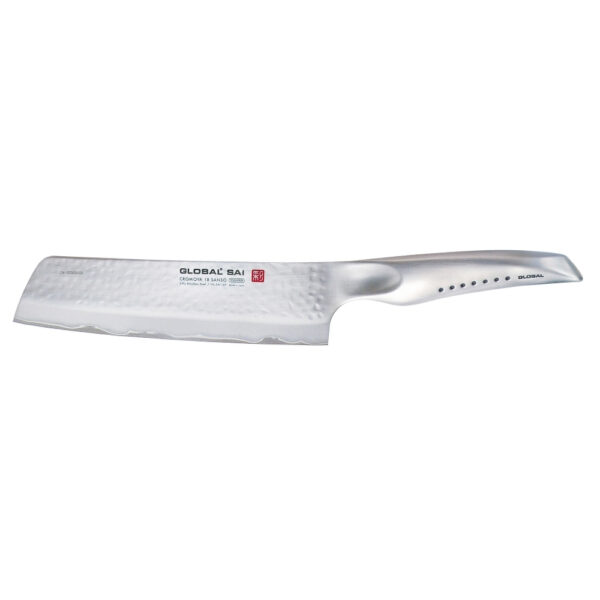 I coltelli Global della Serie SAI sono stati progettati da Komin Yamada, creatore del primo coltello Global. È una Serie per professionisti e appassionati. Possiedono le seguenti caratteristiche: – design del manico ergonomico, con un incavo per il pollice per facilitare il taglio. I 7 punti rappresentano il bushido del guerriero e ogni punto simboleggia le virtù di un samurai; – le lame sono realizzate nello speciale acciaio CROMOVA 18 Sanso composto da tre strati sovrapposti in acciaio inossidabile. La parte centrale è composta da CROMOVA 18 acciaio inossidabile, temperato Rockwell 58-59 gradi e levigato sul bordo così da garantire eccezionali prestazioni di taglio. I due strati più esterni sono invece in acciaio inossidabile SUS410 (più “morbido”) che protegge la lama da scheggiature, ruggine e macchie; – finitura “martellata” su entrambi i lati della lama: non è soltanto un decoro, ma una lavorazione che evita che durante le operazioni di taglio restitino appiccicati residui di cibo sulla lama.