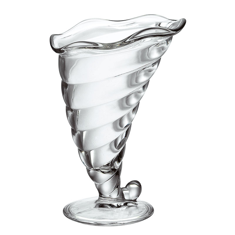 Coppa da dessert lavorata, dalla forma che riprende quella della cornucopia, simbolo per eccellenza di buona sorte. È stata studiata per valorizzare i gelati e i dessert a base di frutta. Forma e decori ne esaltano infatti i colori, le consistenze e la freschezza e la capienza permette di sbizzarrirsi con abbondanti ed estrose decorazioni. Capacità: 32 cl. Dimensioni: max Ø 87 x H 180,5 mm. In vetro trasparente.