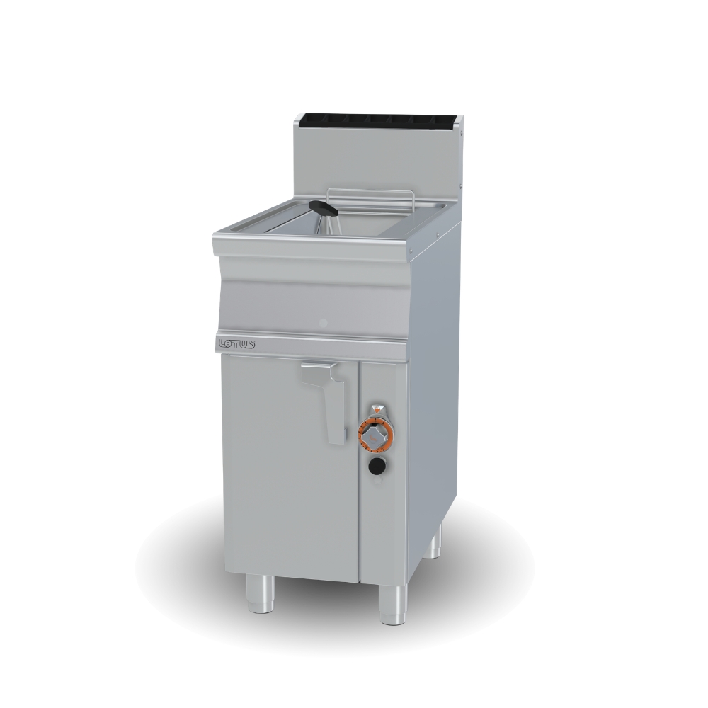 La friggitrice a gas F13-74G della linea 70 Superlotus è progettata per un utilizzo professionale intensivo, offrendo elevate prestazioni in un formato compatto. La vasca da 13 litri la rende ideale per cucine con spazi limitati o per utilizzi specifici, garantendo comunque una produzione efficiente. La struttura in acciaio inox AISI 304 (CrNi 18/10) con finitura Scotch-Brite assicura resistenza alla corrosione, igiene e lunga durata nel tempo. Il piano di lavoro con spessore di 2 mm e alzatina posteriore migliora la sicurezza e facilita la pulizia. La vasca è dotata di coperchio, cesto in rete d’acciaio cromato e filtro vasca con supporto cestino, garantendo elevati standard di igiene. La presenza della bacinella raccogliolio con sistema di filtraggio integrato facilita la gestione dell’olio e la manutenzione. Il sistema con bruciatori ad alta potenza e accensione piezoelettrica consente un rapido riscaldamento e una distribuzione uniforme del calore, mentre la valvola termostatica con termocoppia garantisce sicurezza e controllo preciso della temperatura. La manutenzione è semplificata grazie al facile accesso ai componenti interni, mentre i piedini regolabili permettono un corretto posizionamento dell’attrezzatura. Caratteristiche tecniche: – Tipologia: friggitrice a gas su mobile; – Capacità: 13 lt; – Numero vasche: 1; – Dimensioni vasca: 24 x 35 x 38 h cm; – Produzione patatine: 10 kg/h; – Dimensioni esterne: L 40 x P 70,5 x H 90 cm; – Potenza gas: 9,3 kW; – Alimentazione: gas metano / GPL; – Struttura: acciaio inox AISI 304 (CrNi 18/10); – Spessore piano: 2 mm; – Bruciatori: ad alta potenza con fiamma pilota; – Accensione: piezoelettrica; – Sicurezza: valvola termostatica con termocoppia; – Cesto: acciaio cromato; – Coperchio vasca: sì; – Filtro vasca: sì; – Bacinella raccogliolio: con filtro inclusa; – Allacciamento gas: ISO 7-1 1/2″ M; – Piedini: regolabili; – Dotazioni: ugelli per cambio tipologia gas.