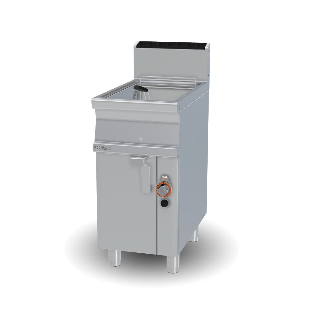 Friggitrice a gas professionale con vasca da 18 lt, ideale per cucine horeca che richiedono maggiore produttività. Struttura realizzata in acciaio inox AISI 304 (CrNi 18/10) con piano di lavoro spessore 2 mm e alzatina posteriore. Dotata di cesto in acciaio cromato, coperchio vasca, filtro e bacinella raccogliolio con filtro inclusa. Sistema con bruciatori ad alta potenza 13,5 kW e accensione piezoelettrica. Dimensioni esterne: L 40 x P 70,5 x H 90 cm.