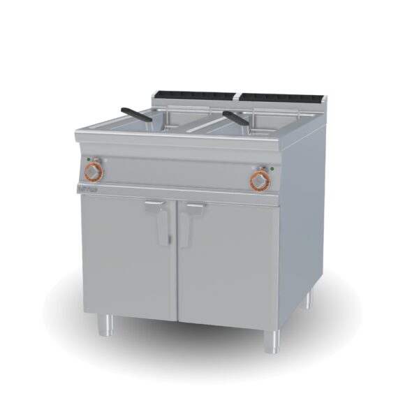 Friggitrice a gas professionale con 2 vasche da 18+18 lt, ideale per cucine horeca ad alta produttività. Struttura realizzata in acciaio inox AISI 304 (CrNi 18/10) con piano di lavoro spessore 2 mm e alzatina posteriore. Dotata di bruciatori ad alta potenza con fiamma pilota, valvole termostatiche con termocoppia e cesti in rete d’acciaio cromato. Dimensioni esterne: L 80 x P 90 x H 90 cm. Produzione patate: 30 kg/h.