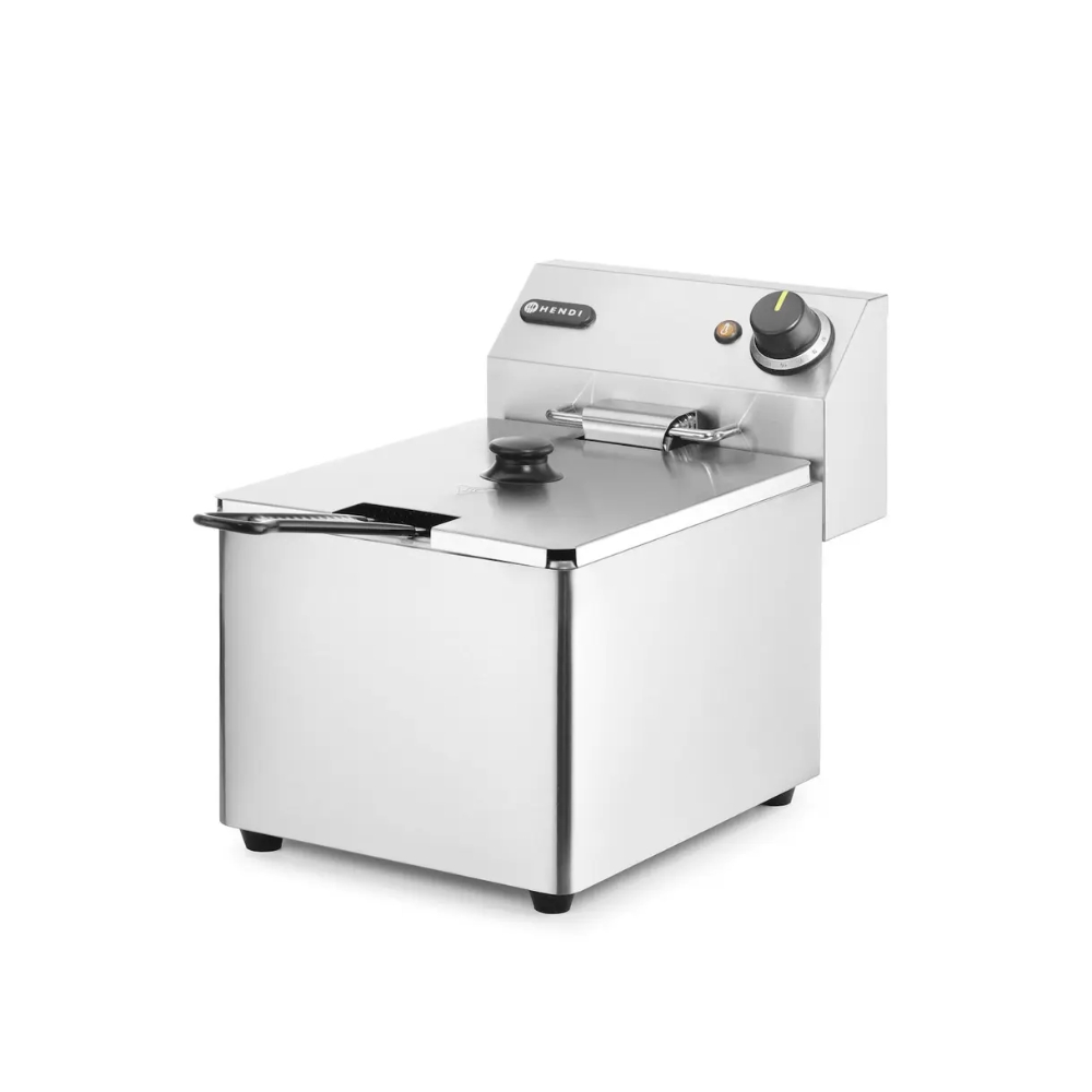 Volume utile: 8 lt. Dimensioni: L 265 x P 430 x H 350 mm. Struttura e vasca in acciaio. Elemento removibile con una funzione di disinserimento quando viene rimosso. Contenitore rimovibile, per una migliore pulizia. Lampada di controllo per indicare il funzionamento della resistenza. La temperatura è regolabile fino a 190°C. Un termostato di sicurezza protegge la friggitrice dal surriscaldamento. Cestello per friggere con manico isolato ed extra lungo. Zona fredda per preservare l’olio di frittura. Fornita con cestello e coperchio.