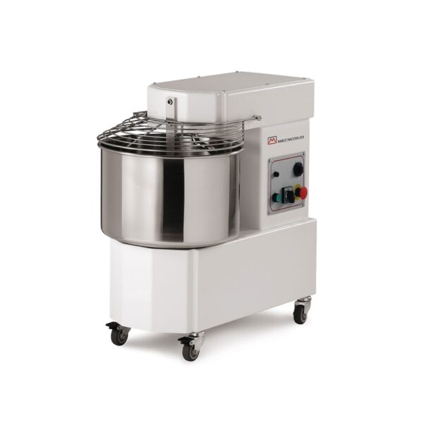 L’impastatrice a spirale IM12M della serie IM Mecnosud è una macchina compatta e affidabile, progettata per soddisfare le esigenze di pizzerie, panifici, pasticcerie e anche utilizzi domestici evoluti. Grazie alla sua struttura solida e ai materiali di alta qualità, garantisce prestazioni costanti e una lunga durata anche in caso di utilizzo frequente. La vasca, la spirale e il piantone sono realizzati in acciaio inox ad alta resistenza, assicurando igiene, facilità di pulizia e resistenza all’usura. Il sistema di trasmissione con motoriduttore a bagno d’olio consente un funzionamento fluido e silenzioso, migliorando l’affidabilità complessiva della macchina. La macchina è dotata di griglia di protezione in acciaio inox e impianto elettrico conforme alle normative CE, con dispositivi di sicurezza integrati. La struttura in acciaio ad elevato spessore e la verniciatura con polveri epossidiche atossiche la rendono particolarmente resistente e adatta al contatto con alimenti. Caratteristiche tecniche: – Capacità impasto: 12 kg; – Capacità farina: 8 kg; – Volume vasca: 15 lt; – Dimensioni vasca: 317 x 210 mm; – Potenza motore: 0,9 kW; – Alimentazione: 230 V monofase; – Peso: 60 kg.