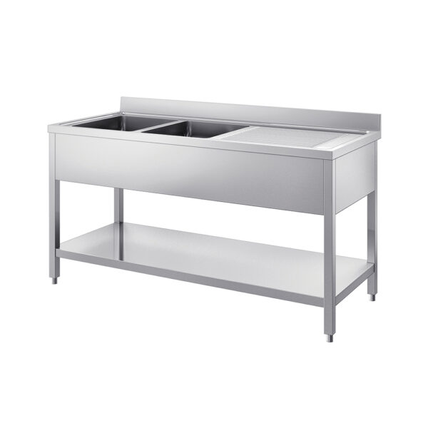 Il lavello con ripiano, doppia vasca e gocciolatoio è una soluzione pratica e funzionale per l’allestimento di cucine professionali e ambienti del settore Ho.Re.Ca., dove sono fondamentali organizzazione, igiene e resistenza. Realizzato interamente in acciaio inox, garantisce elevata resistenza alla corrosione, agli agenti chimici e all’usura dovuta all’utilizzo intensivo. Le superfici lisce facilitano la pulizia e assicurano il rispetto degli standard igienici richiesti nelle cucine professionali. La presenza delle 2 vasche consente di gestire in modo efficiente le diverse fasi di lavaggio, risciacquo e preparazione, migliorando il flusso di lavoro. Il gocciolatoio laterale destro permette di appoggiare stoviglie e utensili, facilitando lo sgrondo dell’acqua e mantenendo il piano di lavoro ordinato. Il ripiano inferiore offre uno spazio aggiuntivo per lo stoccaggio di attrezzature e materiali di uso frequente, contribuendo a ottimizzare gli spazi operativi. Una soluzione affidabile e versatile, ideale per ristoranti, laboratori e cucine professionali.