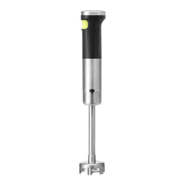 Realizzato in acciaio inossidabile satinato e ABS. Braccio di miscelazione rimovibile con lama a S. Funzione Smart Pressure: più il pulsante viene premuto, maggiore è la velocità della lama, mentre la regolazione continua della velocità garantisce un migliore controllo sul processo di miscelazione. 5 rapporti: da 11.000 giri/min (ingranaggio 1) a 16.000 giri/min (ingranaggio 5). Senza fili e ricaricabile, con batteria integrata: 2000 mAh, 150 W, 7,4 V. Indicatore dei 4 livelli di carica della batteria (100-75-50-25%) nella parte superiore. Tempo di funzionamento: fino a 30 minuti quando è completamente carico. Protezione: dopo 3 secondi di inattività la lama è bloccata. Voltaggio: 230 V. Dimensioni: Ø 65 x H 390 mm. Lunghezza del manico: 227 mm. Lunghezza dell’asta: 165 mm. Peso netto (kg): 0,64.