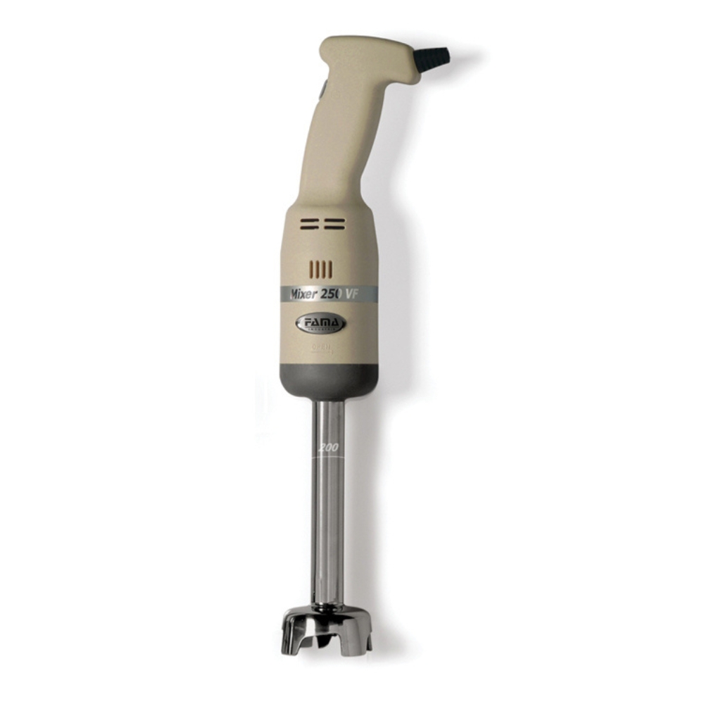 Macchinario per uso professionale a velocità fissa. Corpo realizzato in plastica, dal peso contenuto e di facile utilizzo. Motore ventilato. Termica di protezione al motore. Sistema elettronico di stabilizzazione di velocità e potenza SRS (self-regulating-speed). Giunti di connessione in polimero ad alta resistenza. Apparecchio certificato da ente di controllo. Norme CE. Fabbricato in Italia. Alimentazione: 230 V – 50/60 Hz. Potenza: 250 W. Velocità: (Giri/Rpm): 15.000. Dimensioni corpo motore: Ø 75 mm, lunghezza 285 mm. Asta mescolatrice con bilama in acciaio inox. Ideale per frullare zuppe di verdura, purè, salse, ecc. Larghezza parte inferiore dell’asta: 75 mm.