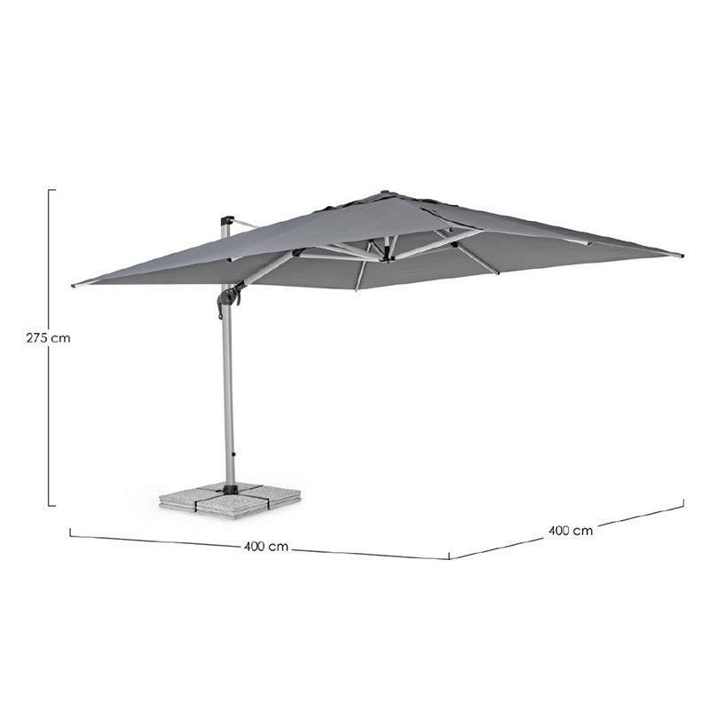 Struttura in alluminio anodizzato. Palo 100 x 60mm. 8 Stecche 33 x 20 mm. Telo grigio scuro in poliestere 250gr/m2 con rivestimento in PA (poliammide). Base a croce in acciaio. Palo girevole 360° con pedalina. Inclinazione verticale con impugnatura a 5 posizioni. Dotato di maniglia per inclinazione ombrello destra/sinistra. Comprensivo di copriombrellone. Marmette non incluse. Predisposizione lampada led e speaker. Si raccomanda l’uso di almeno 8 marmette non incluse (160/200kg). Dimensioni: 400 x 400 x H 275 cm.