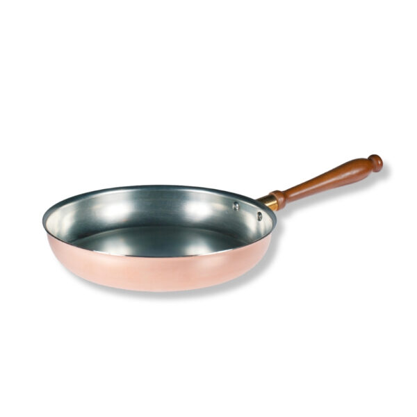 Padella leggera in rame stagnato a mano 2 mm, ideale per flambeau, con un manico in legno e ottone. Adatta per piani cottura a gas, elettrici e radianti. Dimensioni: Ø 28 x H 4,5 cm.