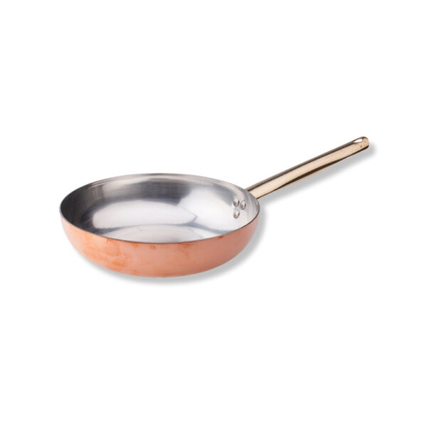 Padella svasata alta “saltare” in rame liscio stagnato a mano 2 mm. 1 manico tubolare in ottone. Non lavabile in lavastoviglie. Adatta per piani cottura a gas, elettrici e radianti.