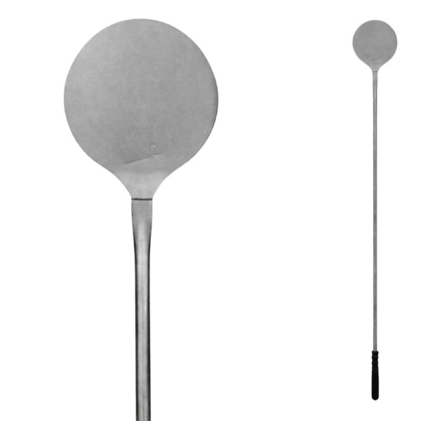 Pala in acciaio inox con due manici in gomma anti olio, uno dei quali scorrevole, per evitare scottature, inoltre permette con una leggera pressione della mano di aver un controllo anche con una sola mano, ed è agganciabile con il manico fisso posteriore. I manici sono facilmente smontabili per la pulizia.