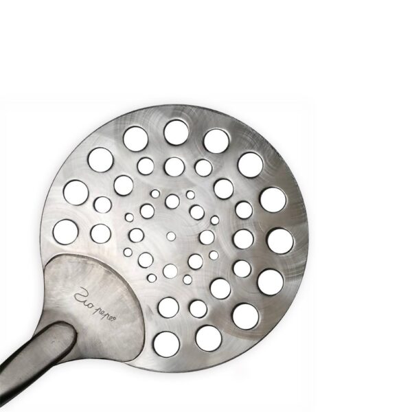 Costruita in acciaio inox 18/10 è dotata di due manici in ABS, uno dei quali scorrevole e frizionato per agevolare il lavoro, con scudo per evitare scottature, garantisce stabilità e sicurezza. I fori del piatto sono studiati con diametro in crescendo dal centro verso l’esterno e permettono di scaricare i residui di farina, garantiscono inoltre una maggiore aderenza nel far ruotare la pizza. Dimensioni: testa Ø 20 cm. Lunghezza totale: 220 cm.