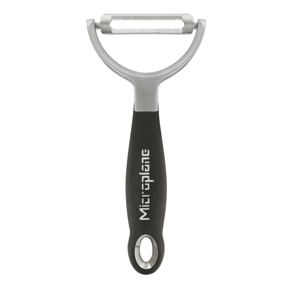 Comodo design a forma di Y per il massimo controllo durante la pelatura. Morbida impugnatura nera soft touch, ergonomica e antiscivolo. Doppia lama seghettata ultra-affilata in acciaio inossidabile per pelare con facilità. Ideale per una varietà di frutta e verdura, in special modo a buccia morbida, come pomodori, pesca, kiwi e mango.