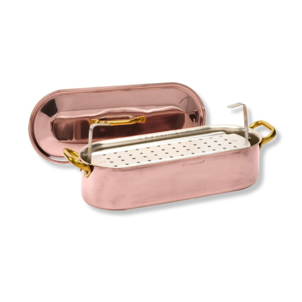 Pesciera con griglia e coperchio in rame liscio stagnato a mano 2 mm. Due maniglie e manico coperchio in ottone. Adatta per i piani cottura a gas, elettrici, radianti e forno. Non lavabile in lavastoviglie. Dimensioni: 40 x 17 x H 10 cm. Utilizzata principalmente per cuocere pesci in umido ma può essere usata anche per la preparazione di altri cibi.