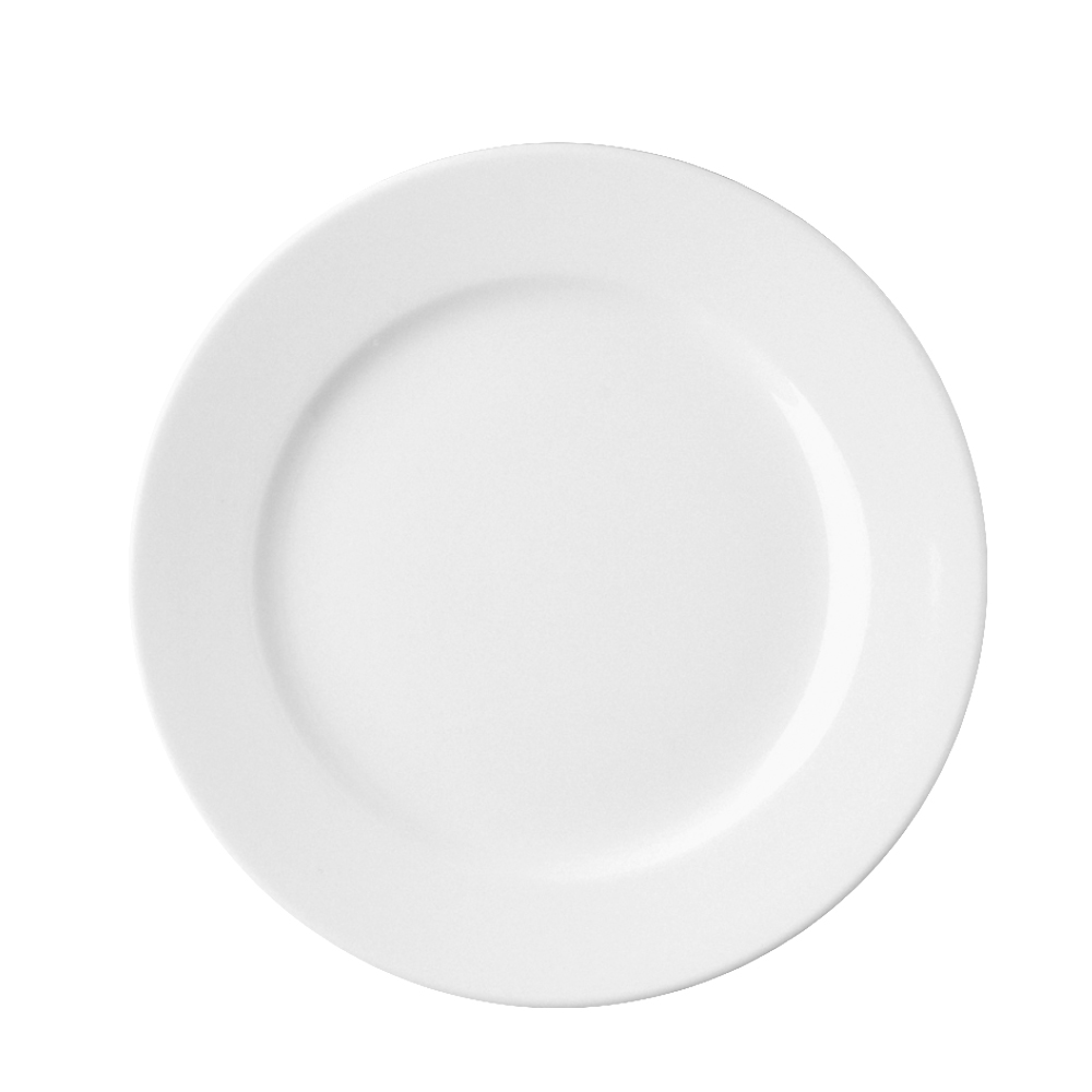 Piatto piano con bordo. Materiale: porcellana. Colore: bianco. Adatto al microonde. Lavabile in lavastoviglie.