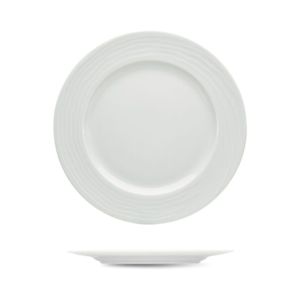 Piatto piano in porcellana professionale linea Maitre, caratterizzato da un elegante un decoro a onde simile a delle venature in leggero rilievo che dona profondità visiva alla superficie. Ideale per il servizio di portate principali, secondi piatti e presentazioni curate. Resistente, lavabile in lavastoviglie e adatto al microonde.