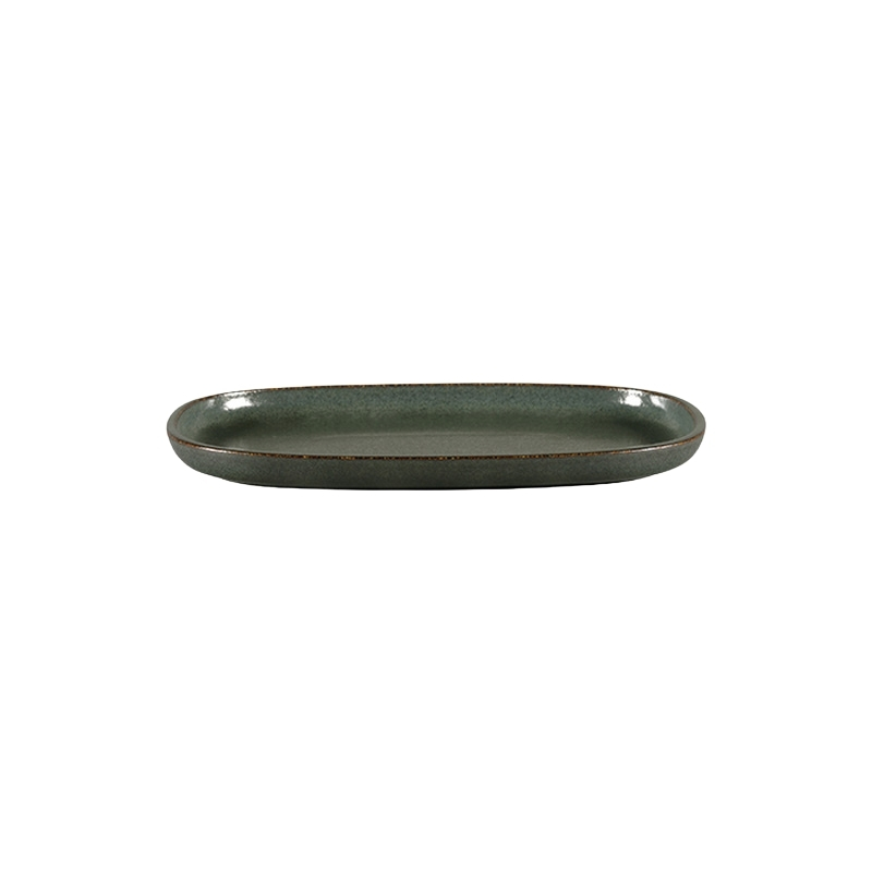 Piatto piano ovale con bordo dritto. Materiale: rackstone (pietra di Rak). Colore: verde caldera. Adatto al microonde. Lavabile in lavastoviglie. Decorato a mano.